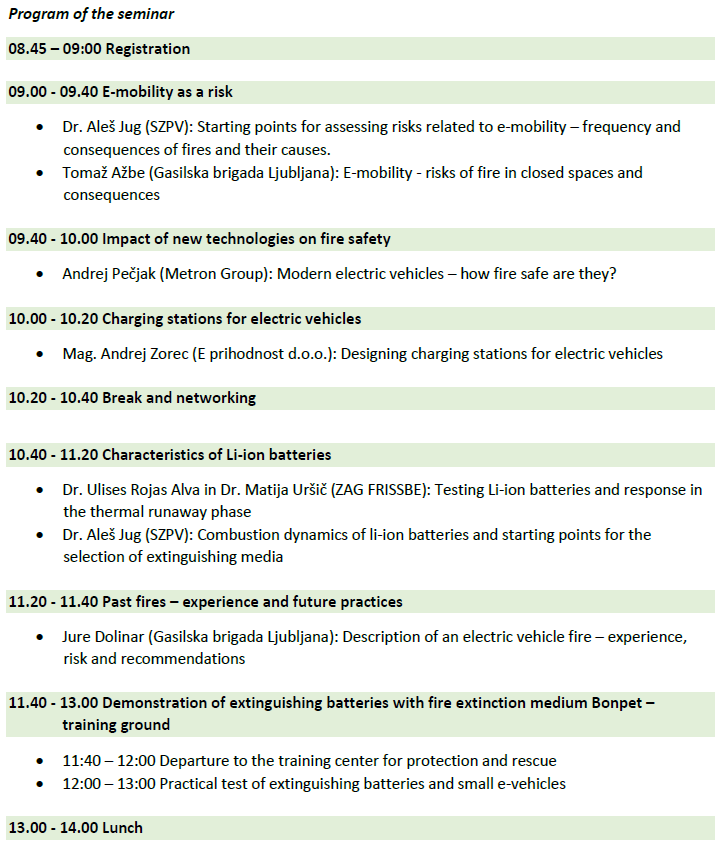 In the seminar, Dr. Ulises Rojas Alva and Dr. Matija Uršič from ZAG presented the talk "Testing Li-ion batteries and response in the thermal runaway phase", and Dr. Aleš Jug presented the talk "Starting points for assessing risks related to e-mobility – frequency and consequences of fires and their causes. " and "Combustion dynamics of li-ion batteries and starting points for the selection of extinguishing media".